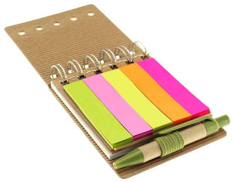 Memo Set Ecológico. Incluye Bolígrafo Ecológico corto + 125 banderitas adhesivas de colores + 25 notas adhesivas cuadradas + Block de Notas 40 hojas blancas. Tapas gruesas cartón ecológico 600gsm, exterior liso/interior plisado, en Espiral Doble Cero Metálico.